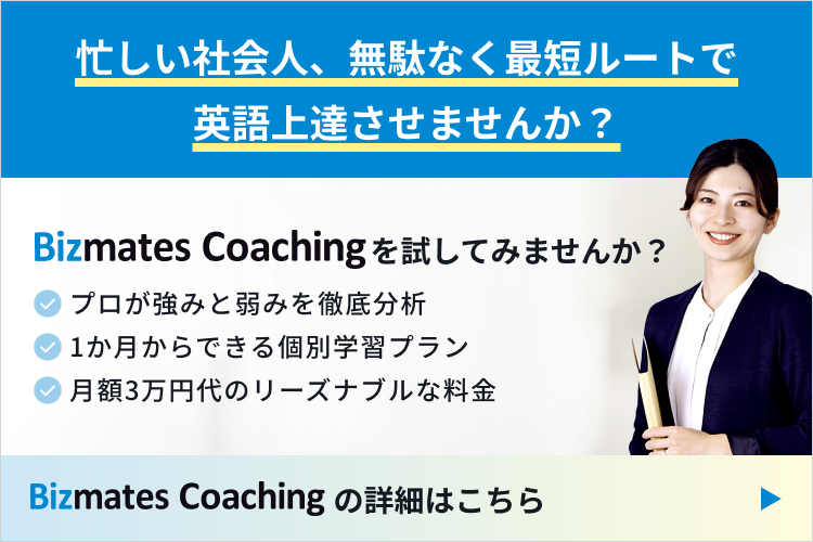 ビジネス英語を最短で習得したいなら、ぜひ「Bizmates coaching」にご相談ください専属の日本人コンサルタントが、あなたオリジナルの学習内容と学習方法をご提案しながら目標達成まで伴走します。